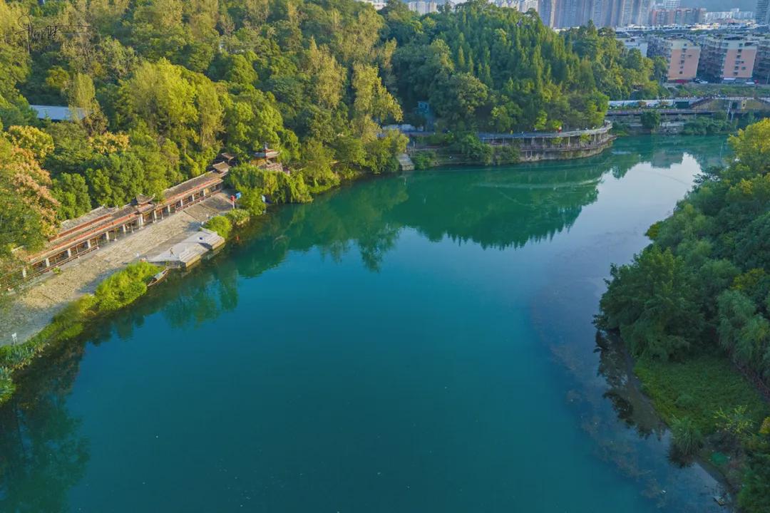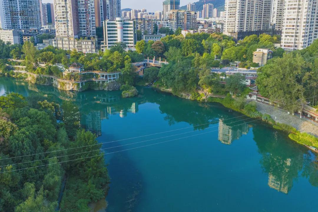 俯瞰视角下,公园里的亭台水榭和游步道在郁郁葱葱的绿化植被掩映中尽显清幽,人们在这里找到适合自己的角落,尽情享受着铜仁这座城市带给他们的的宜居氛围。