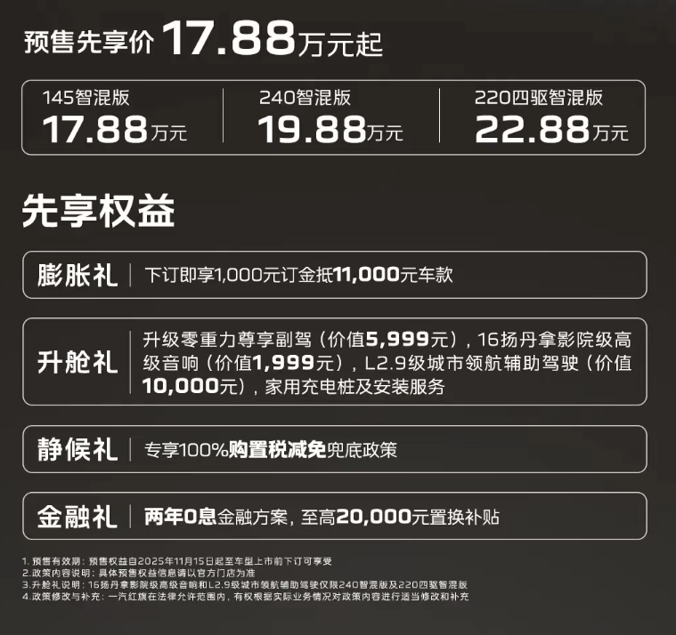 ●升级零重力尊享副驾(价值5,999元),16扬丹拿影院级高升舱礼级音响(价值1,999元),L2.9级城市领航辅助驾驶(价值10.000元),家用充电桩及安装服务