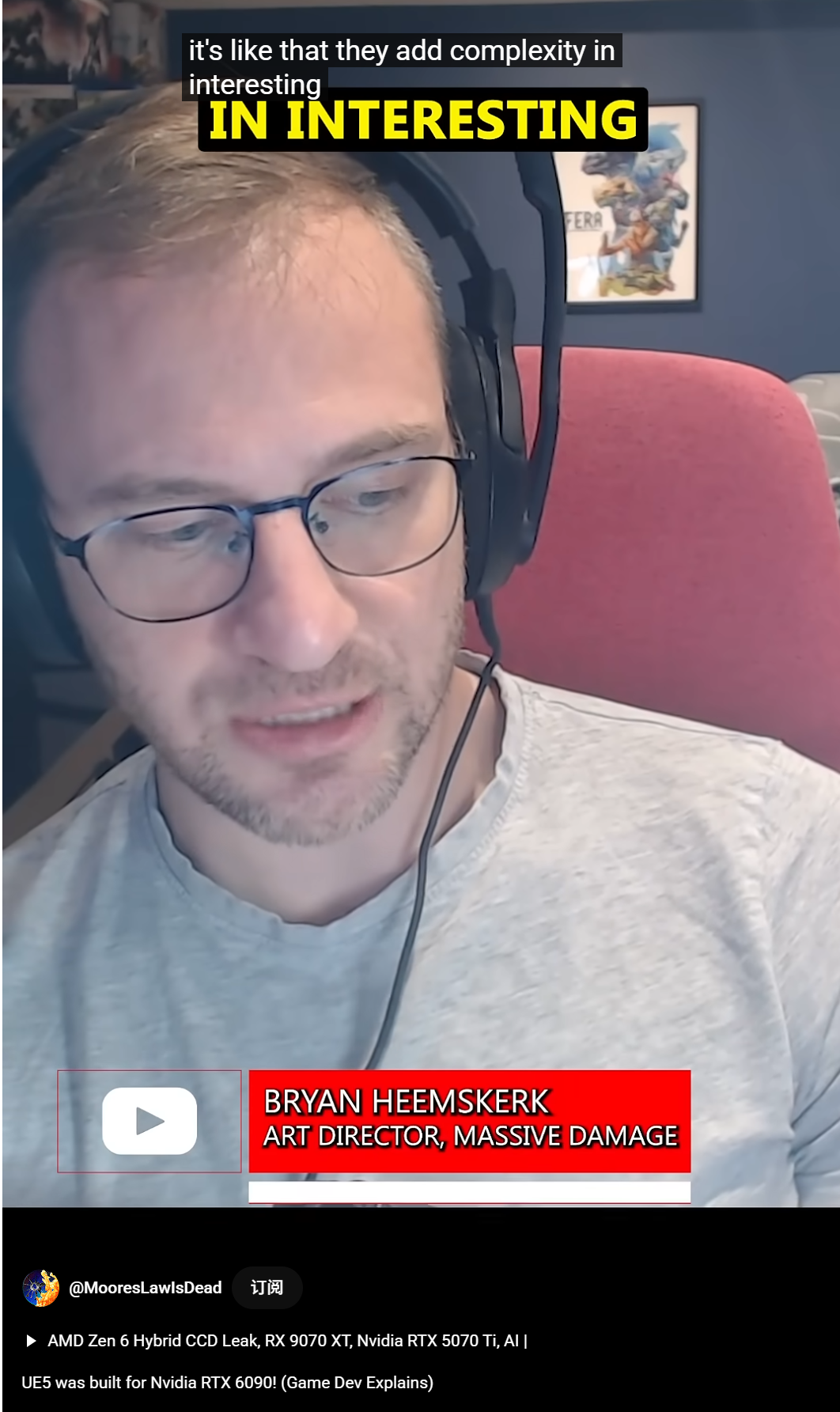 在今年2月底国外知名硬件博主Moore's Law Is Dead(摩尔定律已死)的博客节目\"AMD Zen6 Hybrid CCD Leak,RX 9070XT,NVIDIA 5070TI,AI\"中,来自开发商Masive Damage的技术负责人Bryan Heemskerk提出他对虚幻5看法。